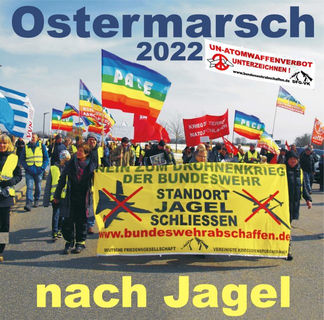 Gerade jetzt! Ostermarsch von Schleswig nach Jagel Karfreitag, 15.4.2022, 11.58 ab Bahnhof Schleswig Krieg ist ein Verbrechen an den Menschen und kein Mittel der Politik Deshalb verurteilen wir den Angriffskrieg der russischen Regierung auf die Ukraine. Wir brauchen eine demokratische und diplomatische Lösung des Konfliktes durch Verhandlungen und nicht das Recht des Stärkeren. UN-Atomwaffenverbotsvertrag unterzeichnen…