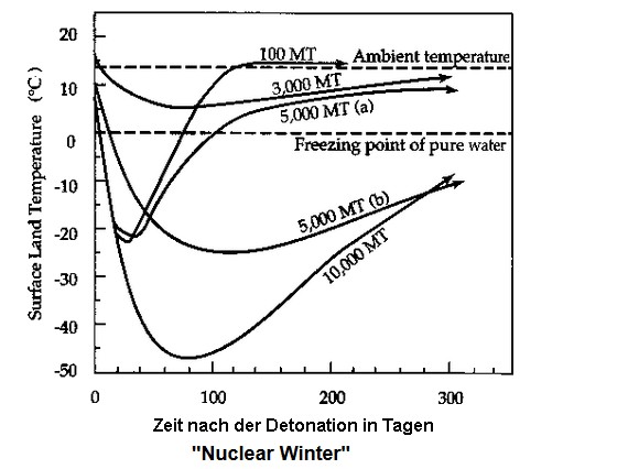 Nur 100 Mini-Nukes würden durch die entstehenden Flächenbrände Feuerstürme auslösen und Rußpartikel hoch in die Troposphäre tragen. Die Erde würde großflächig verdunkelt, ein Phänomen, das von großen Vulkanausbrüchen her bekannt ist. Aber anders als bei Vulkanausbrüchen, bei denen die Partikel meist transparent sind, würden die schwarzen Rußpartikel von der Sonne erwärmt und in die Stratosphäre aufsteigen. Innerhalb weniger Wochen verteilt sich der Dunst über die gesamte Erde. Weltweit würde die Sonneneinstrahlung reduziert und die Durchschnittstemperatur würde um 1,25 Grad C sinken. Die Temperaturveränderung geschähe nicht allmählich wie beim Klimawandel, sondern innerhalb von Wochen. 10 Jahre würde es dauern, bis die Partikel auf die Erde abgesunken seien. 10 Jahre lang würde eine Abkühlung der Jahresdurchschnittstemperatur anhalten.